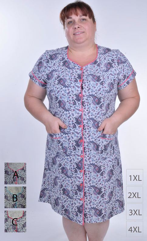 Описание: Халат из хлопка для полных женщин. Отличный вариант для домашних дел с удобным коротким рукавом, оптимальной длинной и набивным рисунком.