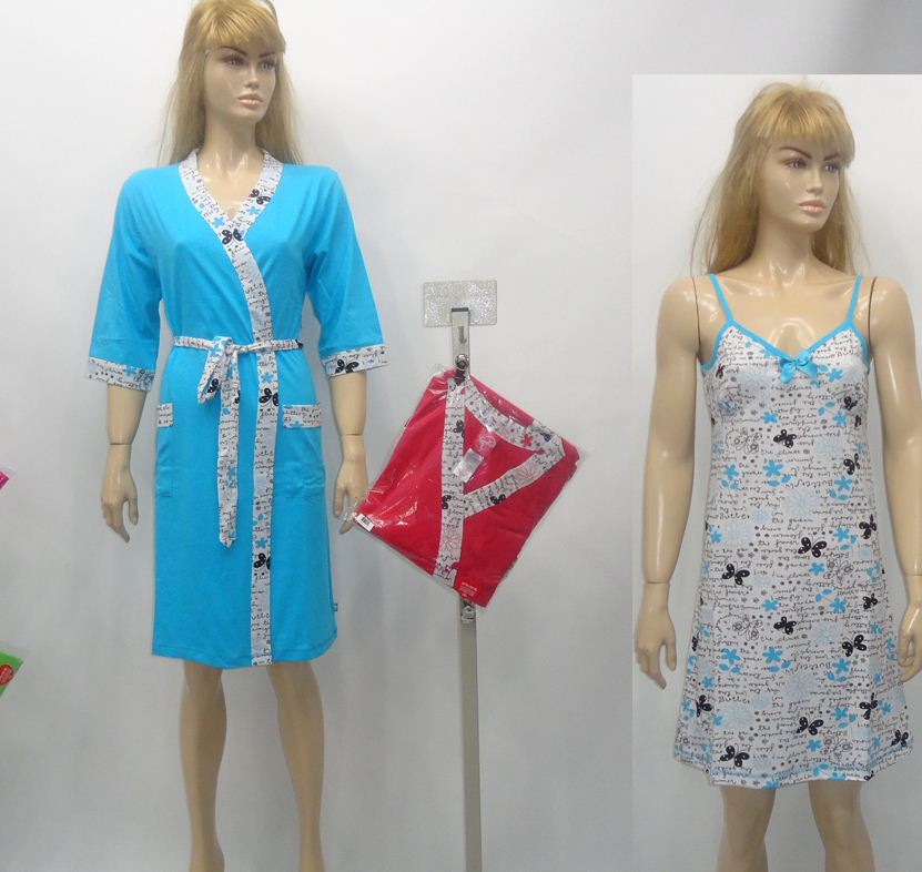 Описание: Однотонный халат с рукавом 3/4 и туника на тонких лямочках из 100% хлопка. Однотонный зелёный, голубой или красный цвет в сочетании с лёгким рисунком из цветов и бабочек позволит чувствовать себя привлекательной даже дома.